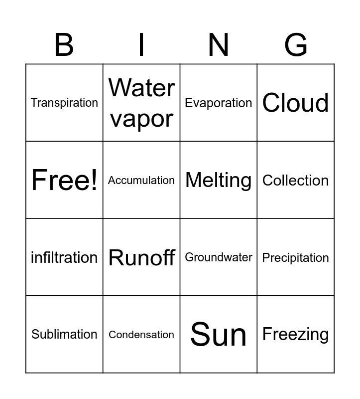 This bingo card has 16 words: Condensation, Precipitation, Evaporation, Transpiration, infiltration, Water vapor, Groundwater, Sun, Free!, Accumulation, Sublimation, Cloud, Runoff, Collection, Melting and Freezing.