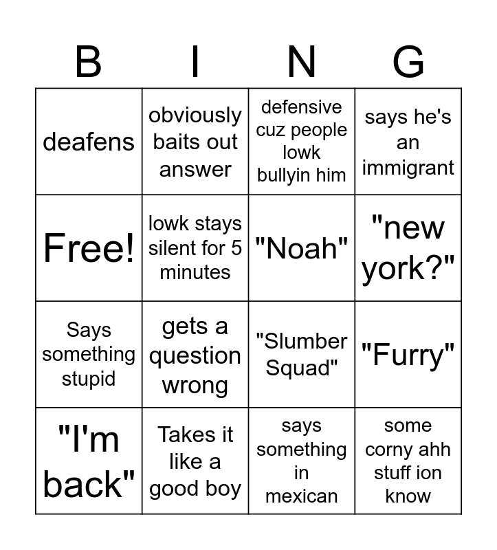 This bingo card has 16 words: Takes it like a good boy, "Furry", defensive cuz people lowk bullyin him, deafens, Says something stupid, obviously baits out answer, "Slumber Squad", says something in mexican, Free!, lowk stays silent for 5 minutes, "I'm back", says he's an immigrant, gets a question wrong, "new york?", "Noah" and some corny ahh stuff ion know.