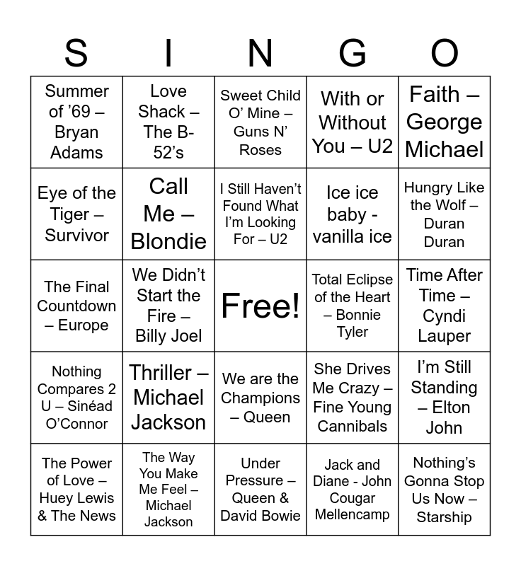 This bingo card has a free space and 81 words: Billie Jean – Michael Jackson, Like a Virgin – Madonna, Sweet Child O’ Mine – Guns N’ Roses, Take On Me – a-ha, Livin’ on a Prayer – Bon Jovi, Girls Just Want to Have Fun – Cyndi Lauper, Don’t Stop Believin’ – Journey, Every Breath You Take – The Police, Beat It – Michael Jackson, I Wanna Dance with Somebody – Whitney Houston, Africa – Toto, Wake Me Up Before You Go-Go – Wham!, With or Without You – U2, Summer of ’69 – Bryan Adams, Tainted Love – Soft Cell, Eye of the Tiger – Survivor, Sweet Dreams (Are Made of This) – Eurythmics, Thriller – Michael Jackson, Don’t You Want Me – The Human League, Time After Time – Cyndi Lauper, Footloose – Kenny Loggins, Faith – George Michael, The Final Countdown – Europe, I Still Haven’t Found What I’m Looking For – U2, Call Me – Blondie, Take My Breath Away – Berlin, Jessie’s Girl – Rick Springfield, Careless Whisper – Wham!, Walk Like an Egyptian – The Bangles, Everybody Wants to Rule the World – Tears for Fears, Hungry Like the Wolf – Duran Duran, Don’t You (Forget About Me) – Simple minds, Under Pressure – Queen & David Bowie, I Love Rock ’n Roll – Joan Jett & the Blackhearts, The Power of Love – Huey Lewis & The News, Total Eclipse of the Heart – Bonnie Tyler, We Built This City – Starship, Jump – Van Halen, How Will I Know – Whitney Houston, Karma Chameleon – Culture Club, Nothing’s Gonna Stop Us Now – Starship, True – Spandau Ballet, I Want to Know What Love Is – Foreigner, Walking on Sunshine – Katrina and the Waves, We Didn’t Start the Fire – Billy Joel, Rock You Like a Hurricane – Scorpions, Love Shack – The B-52’s, Hungry Eyes – Eric Carmen, Down Under – Men at Work, You Spin Me Round (Like a Record) – Dead or Alive, She Drives Me Crazy – Fine Young Cannibals, I’m Still Standing – Elton John, If You Leave – Orchestral Manoeuvres in the Dark, We Are the World – USA for Africa, Heaven Is a Place on Earth – Belinda Carlisle, I Melt with You – Modern English, Shout – Tears for Fears, Jump (For My Love) – The Pointer Sisters, Riot – Duran Duran, Back in Black – AC/DC, We are the Champions – Queen, Endless Love – Diana Ross & Lionel Richie, 1999 – Prince, Let’s Hear It for the Boy – Deniece Williams, We Got the Beat – The Go-Go’s, Walk of Life – Dire Straits, Funkytown – Lipps Inc., I Can’t Go for That (No Can Do) – Hall & Oates, Holding Out for a Hero – Bonnie Tyler, Man in the Mirror – Michael Jackson, Bette Davis Eyes – Kim Carnes, Nothing Compares 2 U – Sinéad O’Connor, The Way You Make Me Feel – Michael Jackson, Red red wine - UB40, Danger zone - Kenny Loggins, Superstition - Stevie Wonder, I want candy - bow wow wow, Jack and Diane - John Cougar Mellencamp, Chains of love - erasure, Ice ice baby - vanilla ice and Too shy - Kajagoogoo.