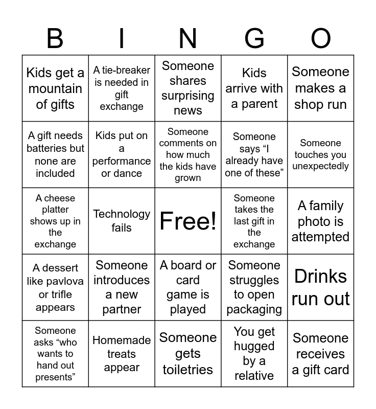 This bingo card has a free space and 45 words: A phone/video call happens, Someone receives a gift card, Kids appear on a call, Someone asks “who wants to hand out presents”, Someone arrives late, You get hugged by a relative, Someone shares surprising news, A holiday movie is watched, Someone makes a shop run, Homemade treats appear, Kids arrive with a parent, Someone takes the last gift in the exchange, A board or card game is played, Someone introduces a new partner, A holiday or trip is given as a gift, Someone gets toiletries, Someone gets socks or underwear, A cheese platter shows up in the exchange, Someone asks about school, work, or uni, Someone touches you unexpectedly, A tie-breaker is needed in gift exchange, Scratchies appear in the gift pile, Someone leaves early, Kids get a mountain of gifts, Someone forgets to bring food, A family photo is attempted, A gift is clearly re-gifted, Two people get the same gift, Someone struggles to open packaging, A dessert like pavlova or trifle appears, Something gets burnt or overcooked, Drinks run out, Someone misplaces a gift or forgets who it’s for, A child cries during gift exchange, Someone tells a long story no one asked for, Technology fails, Someone starts singing, Someone reminisces about last year, Someone talks about next year’s plans, Someone comments on how much the kids have grown, A gift needs batteries but none are included, Someone says “I already have one of these”, Gambling is mentioned, Kids put on a performance or dance and an adult says 6 7.
