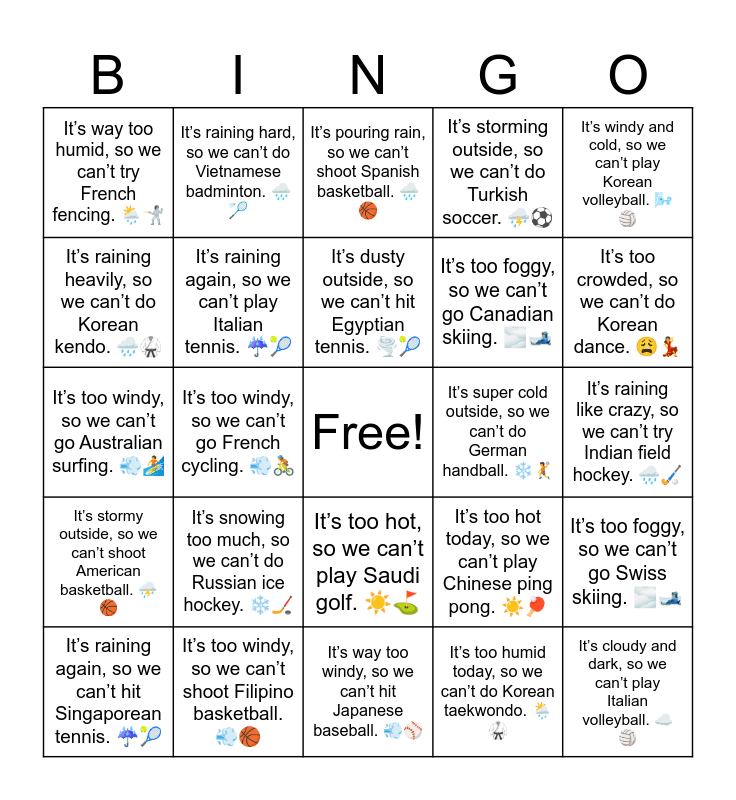 This bingo card has a free space and 32 words: It’s too humid today, so we can’t do Korean taekwondo. 🌦️🥋, It’s raining again, so we can’t play Japanese baseball. 🌧️⚾, It’s too windy, so we can’t go French cycling. 💨🚴, It’s pouring outside, so we can’t do Thai soccer practice. 🌧️⚽, It’s stormy outside, so we can’t shoot American basketball. ⛈️🏀, It’s raining again, so we can’t play Italian tennis. ☔🎾, It’s windy and cold, so we can’t play Korean volleyball. 🌬️🏐, It’s too foggy, so we can’t go Swiss skiing. 🌫️🎿, It’s raining hard, so we can’t do Vietnamese badminton. 🌧️🏸, It’s too hot today, so we can’t play Malaysian soccer. ☀️⚽, It’s dusty outside, so we can’t hit Egyptian tennis. 🌪️🎾, It’s pouring rain, so we can’t shoot Spanish basketball. 🌧️🏀, It’s too warm, so we can’t go Canadian ice skating. 🔥⛸️, It’s raining a lot, so we can’t play Brazilian soccer. 🌧️⚽, It’s super cold outside, so we can’t do German handball. ❄️🤾, It’s snowing hard, so we can’t try Mongolian archery. 🌨️🏹, It’s raining again, so we can’t hit Singaporean tennis. ☔🎾, It’s too windy, so we can’t go Australian surfing. 💨🏄, It’s too hot, so we can’t play Saudi golf. ☀️⛳, It’s snowing too much, so we can’t do Russian ice hockey. ❄️🏒, It’s too hot today, so we can’t play Chinese ping pong. ☀️🏓, It’s too cold today, so we can’t go British cricket. 🥶🏏, It’s raining like crazy, so we can’t try Indian field hockey. 🌧️🏑, It’s too windy, so we can’t shoot Filipino basketball. 💨🏀, It’s cloudy and dark, so we can’t play Italian volleyball. ☁️🏐, It’s storming outside, so we can’t do Turkish soccer. ⛈️⚽, It’s too foggy, so we can’t go Canadian skiing. 🌫️🎿, It’s raining heavily, so we can’t do Korean kendo. 🌧️🥋, It’s way too humid, so we can’t try French fencing. 🌦️🤺, It’s way too windy, so we can’t hit Japanese baseball. 💨⚾, It’s raining again, so we can’t go American skateboarding. 🌧️🛹 and It’s too crowded, so we can’t do Korean dance. 😩💃.