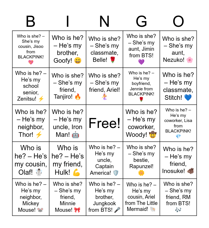 This bingo card has a free space and 33 words: Who is he? โ Heโs my friend, Spider-Man! ๐ท๏ธ, Who is she? โ Sheโs my sister, Elsa! โ๏ธ, Who is he? โ Heโs my uncle, Iron Man! ๐ค, Who is he? โ Heโs my classmate, Anna! ๐, Who is he? โ Heโs my cousin, Olaf! โ๏ธ, Who is she? โ Sheโs my friend, Tanjiro! ๐ฅ, Who is she? โ Sheโs my aunt, Nezuko! ๐ธ, Who is he? โ Heโs my neighbor, Mickey Mouse! ๐ญ, Who is he? โ Heโs my brother, Goofy! ๐, Who is he? โ Heโs my senior, Donald Duck! ๐ฆ, Who is she? โ Sheโs my friend, Ariel! ๐งโโ๏ธ, Who is she? โ Sheโs my classmate, Belle! ๐น, Who is she? โ Sheโs my best friend, Captain Marvel! ๐, Who is he? โ Heโs my cousin, Buzz Lightyear! ๐, Who is he? โ Heโs my coworker, Woody! ๐ค , Who is he? โ Heโs my classmate, Stitch! ๐, Who is she? โ Sheโs my friend, Minnie Mouse! ๐, Who is he? โ Heโs my neighbor, Thor! โก, Who is he? โ Heโs my friend, Hulk! ๐ช, Who is she? โ Sheโs my bestie, Rapunzel! ๐ผ, Who is he? โ Heโs my uncle, Captain America! ๐ก๏ธ, Who is she? โ Sheโs my sister, Mulan! ๐, Who is she? โ Sheโs my cousin, Jisoo from BLACKPINK! ๐, Who is he? โ Heโs my coworker, Lisa from BLACKPINK! ๐, Who is he? โ Heโs my brother, Jungkook from BTS! ๐ค, Who is she? โ Sheโs my friend, RM from BTS! ๐ถ, Who is she? โ Sheโs my aunt, Jimin from BTS! ๐, Who is he? โ Heโs my boyfriend, Jennie from BLACKPINK! ๐น, Who is he? โ Heโs my school senior, Zenitsu! โก, Who is he? โ Heโs my friend, Inosuke! ๐, Who is she? โ Sheโs my little sister, Snow White! ๐, Who is he? โ Heโs my cousin, Ariel from The Little Mermaid! ๐ and Who is she? โ Sheโs my best friend, Moana! ๐.