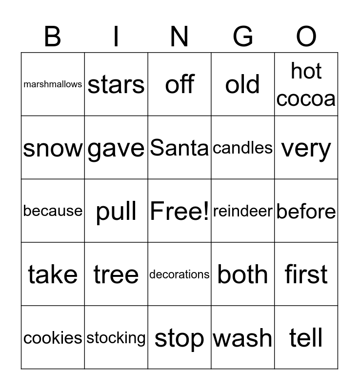 This bingo card has a free space and 24 words: tree, stocking, Santa, cookies, hot cocoa, marshmallows, snow, stars, reindeer, decorations, candles, because, both, first, gave, wash, before, off, very, pull, tell, take, old and stop.