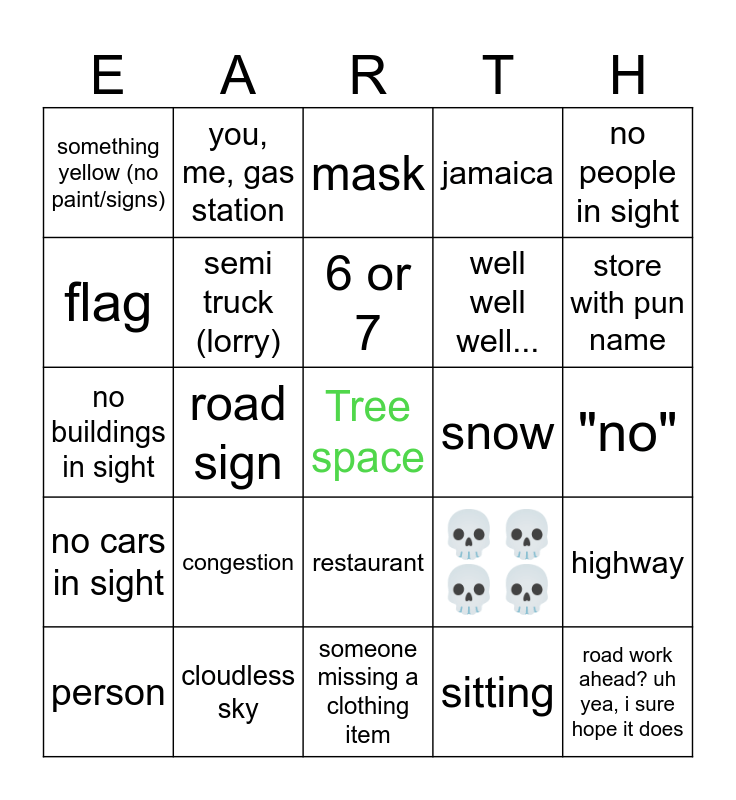 This bingo card has a free space and 29 words: person, car, road sign, street name sign, something yellow (no paint/signs), mask, semi truck (lorry), congestion, snow, cloudless sky, "no", road work ahead? uh yea, i sure hope it does, someone missing a clothing item, sitting, store with pun name, factory, restaurant, no cars in sight, no people in sight, no buildings in sight, 💀💀💀💀, amurica 🦅, well well well..., flag, jamaica, you, me, gas station, highway, 6 or 7 and doggy dog world.