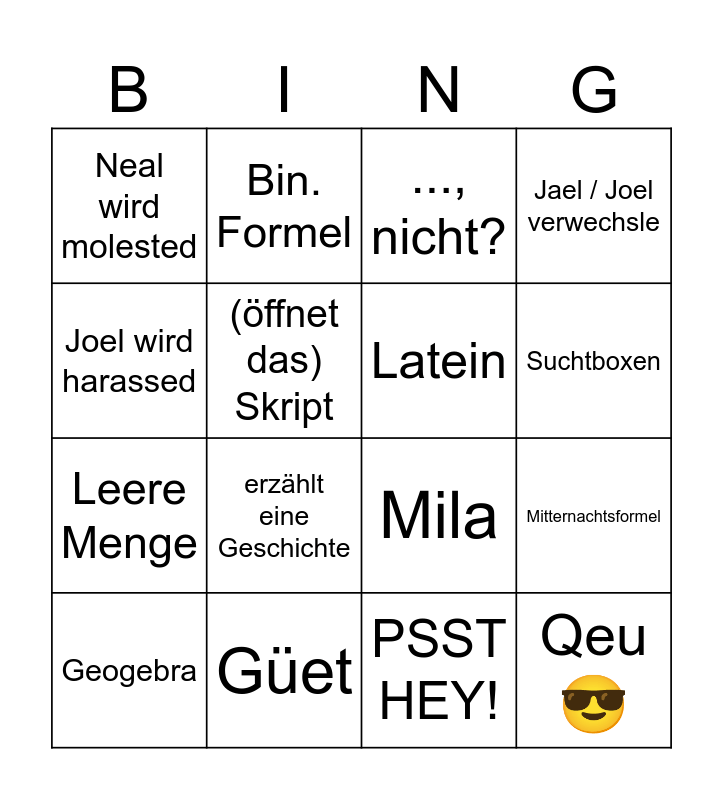 This bingo card has 16 words: Geogebra, Güet, ..., nicht?, Jael / Joel verwechsle, Joel wird harassed, Bin. Formel, Mila, Mitternachtsformel, Neal wird molested, (öffnet das) Skript, PSST HEY!, Suchtboxen, Leere Menge, erzählt eine Geschichte, Latein and Qeu😎.