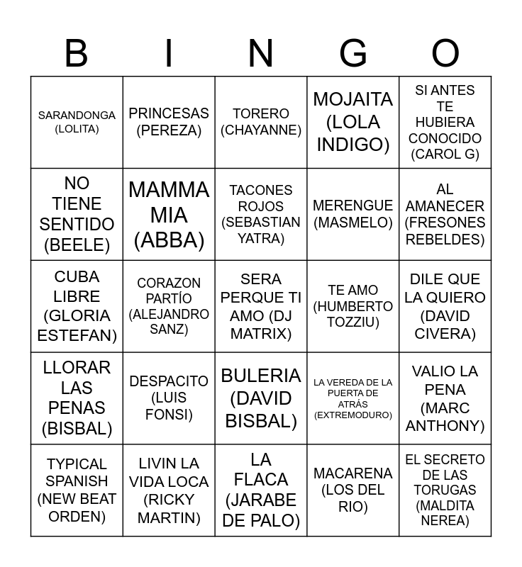 This bingo card has 61 words: Free!, LIVIN LA VIDA LOCA (RICKY MARTIN), LLORANDO EN EL LAMBO (LERICA), LLORAR LAS PENAS (BISBAL), MACARENA (LOS DEL RIO), MADRID CITY (ANA MENA), MAMMA MIA (ABBA), MARTA TIENE UN MARCAPASOS (HOMBRES G), MERENGUE (MASMELO), MI GRAN NOCHE (RAFAEL), MOJAITA (LOLA INDIGO), MORENA MIA (MIGUEL BOSE), NO TIENE SENTIDO (BEELE), NUEVA YORK (BAD BUNNY), QUIERO TENER TU PRESENCIA (SEGURIDAD SOCIAL), SARANDONGA (LOLITA), SERA PERQUE TI AMO (DJ MATRIX), SI ANTES TE HUBIERA CONOCIDO (CAROL G), SOY UN TRUHAN SOY UN SEÑOR (JULIO IGLESIAS), TACONES ROJOS (SEBASTIAN YATRA), TE AMO (HUMBERTO TOZZIU), TORERO (CHAYANNE), TYPICAL SPANISH (NEW BEAT ORDEN), VALIO LA PENA (MARC ANTHONY), VENENO EN LA PIEL (RADIO FUTURA), VIVIR ASI ES MORIR DE AMOR (CAMILO SEXTO), ZAPATILLAS (EL CANTO DEL LOCO), A QUIÉN LE IMPORTA (ALASKA), AL AMANECER (FRESONES REBELDES), AMANTE BANDIDO (MIGUEL BOSE), BAILANDO (ENRIQUE IGLESIAS), BLACK IS BLACK (BRAVOS), BUSCATE A UN HOMBRE QUE TE QUIERA (EL ARREBATO), CAMINANDO POR LA VIDA (MELENDI), PRINCESAS (PEREZA), CAPAZ (ALIEH Y YORGHALI), COLGANDO EN TUS MANOS (CARLOS BAUTE Y MARTA SNCHEZ), CORAZON PARTÍO (ALEJANDRO SANZ), NO SE VE (EMILIA), CUBA LIBRE (GLORIA ESTEFAN), DARTE UN BESO (PRICE ROYCE), DESPACITO (LUIS FONSI), DILE QUE LA QUIERO (DAVID CIVERA), DON’T STOP ME NOW (QUEEN), LA VEREDA DE LA PUERTA DE ATRÁS (EXTREMODURO), EL FIN DEL MUNDO (LA LA LOVES YOU), EL PANTALON (OMAR MONTES), ENTRE DOS TIERRAS (HEROES DEL SILENCIO), SUPERESTRELLA (AITANA), BULERIA (DAVID BISBAL), LA FLACA (JARABE DE PALO), LA MOROCHA (LUCK RA), LA RAJA DE TU FALDA (ESTOPA), LA RAZÓN (ANA MENA), LA VIDA ES UN CARNAVAL (CELIA CRUZ), LIBERTAD (NIL MOLINER), HIPS DON’T LIE (SHAKIRA), OPHELIA (TAYLOR SWIFT), FISICA O QUIMICA (DESPISTAOS), EL SECRETO DE LAS TORUGAS (MALDITA NEREA) and MARTA, SEBAS, GUILLE Y LOS DEMÁS (AMARAL).