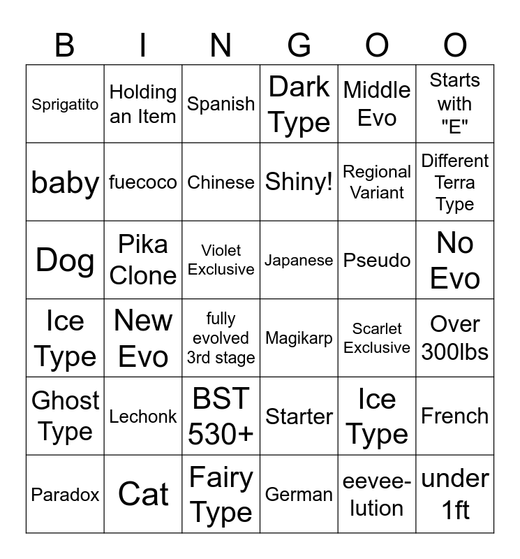 This bingo card has 36 words: Starter, BST 530+, German, baby, Ice Type, Japanese, fuecoco, Fairy Type, Middle Evo, Ice Type, Different Terra Type, Dark Type, French, Pika Clone, Shiny!, Sprigatito, Ghost Type, Pseudo, Dog, Spanish, Violet Exclusive, New Evo, Magikarp, fully evolved 3rd stage, Scarlet Exclusive, Holding an Item, Regional Variant, Cat, Chinese, Starts with "E", under 1ft, Paradox, Over 300lbs, No Evo, Lechonk and eevee-lution.
