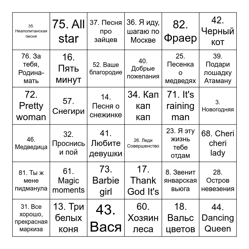 This bingo card has 90 words: 1. Зима-холода, 2. Новогодняя, 3. Новогодняя, 4. Новогодний поцелуй, 5. Happy new year, 6. Last Christmas, 7. Кабы не было зимы, 8. Звенит январская вьюга, 9. Let It Snow, 10. Песенка о медведях, 11. All I want for Christmas is you, 12. It's the most wonderful time of the year, 13. Три белых коня, 14. Песня о снежинке, 15. Разговор со счастьем, 16. Пять минут, 17. Thank God It's, 18. Вальс цветов, 19. Зима (потолок ледяной дверь скрипучая), 20. I want to break free, 21. Бухгалтер, 22. American boy, 23. Я эту жизнь тебе отдам, 24. Девушки как звезды, 25. Песенка о медведях, 26. Леди Совершенство, 27. Помоги мне, 28. Остров невезения, 29. Если б я был султан, 30. Лучший город Земли, 31. Все хорошо, прекрасная маркиза, 32. Проснись и пой, 33. Лесной олень, 34. Кап кап кап, 35. Неаполитанская песня, 36. Я иду, шагаю по Москве, 37. Песня про зайцев, 38. Я тебя подожду, 39. Подари лошадку Атаману, 40. Добрые пожелания, 41. Любите девушки, 42. Черный кот, 43. Вася, 44. Dancing Queen, 45. All my loving, 46. Медведица, 47. Все будет хорошо, 48. Седьмой лепесток, 49. Can't Help Falling in Love, 50. Песенка о дураках, 51. Дурак и молния, 52. Ваше благородие, 53. Комарово, 54. Трава у дома, 55. Одна снежинка - еще не снег, 56. Поручик, 57. Снегири, 58. Московская песня, 59. Песня мушкетеров, 60. Хозяин леса, 61. Magic moments, 62. Strangers in the night, 63. Новогодние игрушки, 64. Снег кружится, 65. Fairytale, 66. Felicita, 67. Sara perche ti amo, 68. Cheri cheri lady, 69. Belle, 70. Ten o'clock postman, 71. It's raining man, 72. Pretty woman, 73. Barbie girl, 74. My heart will go on, 75. All star, 76. За тебя, Родина-мать, 77. Somewhere in my memory, 78. Не оставляй меня, любимый, 79. А я все летала, 80. Новогодняя песня, 81. Ты ж мене пидманула, 82. Фраер, 83. Соловушка, 84. Катя, 85. Главное чтобы костюмчик сидел, 86. Ведьма-речка, 87. Белые розы, 88. Диалог у новогодней елки, 89. Катерок and 90. Песня деда Мороза и Снегурочки.