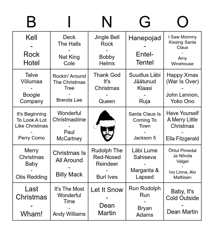 This bingo card has a free space and 29 words: Last Christmas - Wham!, All I Want For Christmas Is You - Mariah Carey, Wonderful Christmastime - Paul McCartney, White Christmas - The Drifters, Kell - Rock Hotel, Jingle Bell Rock - Bobby Helms, Rockin' Around The Christmas Tree - Brenda Lee, Christmas Is All Around - Billy Mack, Santa Claus Is Coming To Town - Jackson 5, It's The Most Wonderful Time - Andy Williams, Have Yourself A Merry Little Christmas - Ella Fitzgerald, Baby, It's Cold Outside - Dean Martin, Let It Snow - Dean Martin, Run Rudolph Run - Bryan Adams, Happy Xmas (War Is Over) - John Lennon, Yoko Ono, Christmas Rappin' - Kurtis Blow, Rudolph The Red-Nosed Reindeer - Burl Ives, Merry Christmas Baby - Otis Redding, I Saw Mommy Kissing Santa Claus - Amy Winehouse, It's Beginning To Look A Lot Like Christmas - Perry Como, Läbi Lume Sahiseva - Margarita & Lapsed, Kes Elab Metsa Sees? - Beergrass, Suudlus Läbi Jäätunud Klaasi - Ruja, Talve Võlumaa - Boogie Company, Hanepojad - Entel-Tentel, Deck The Halls - Nat King Cole, Õhtul Pimedal Ja Nõnda Valgel - Ivo Linna, Alo Mattiisen, Thank God It's Christmas - Queen and Merry Christmas Everyone - Shakin' Stevens.