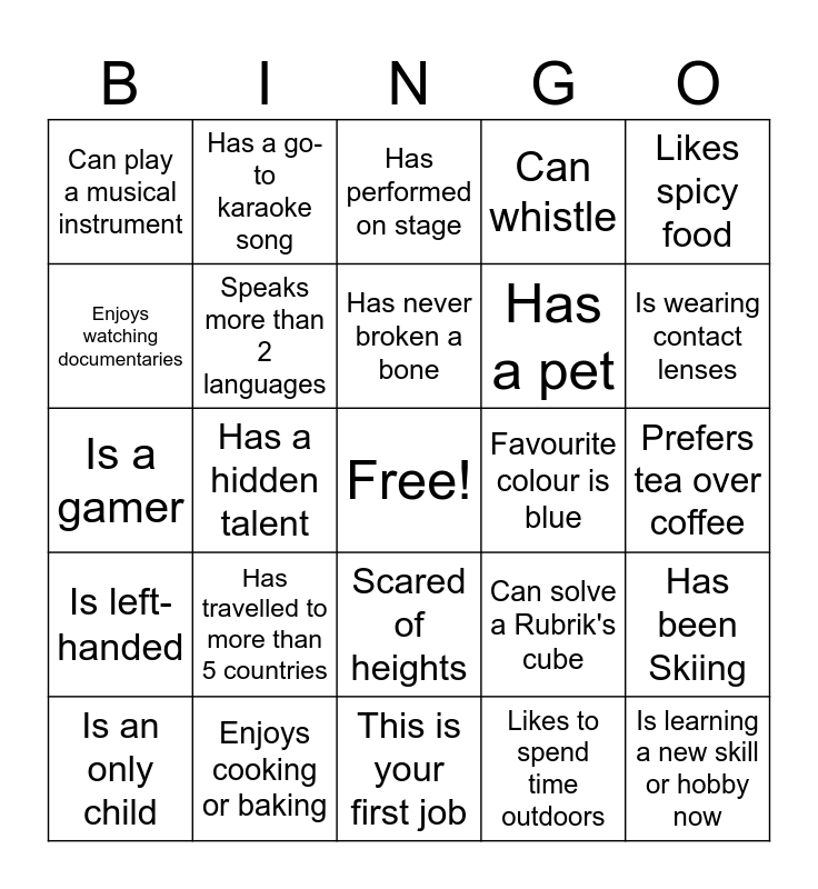 This bingo card has a free space and 24 words: Has travelled to more than 5 countries, Enjoys cooking or baking, Has never broken a bone, Is an only child, Likes spicy food, Can play a musical instrument, Enjoys watching documentaries, Has a go-to karaoke song, Favourite colour is blue, Scared of heights, Has a pet, Is a gamer, Can solve a Rubrik's cube, Has been Skiing, Speaks more than 2 languages, Likes to spend time outdoors, Prefers tea over coffee, Has performed on stage, Is wearing contact lenses, Has a hidden talent, Is learning a new skill or hobby now, Is left-handed, Can whistle and This is your first job.