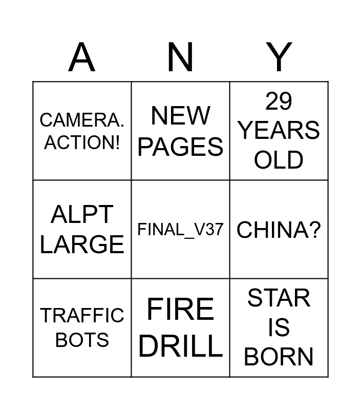 This bingo card has a free space and 8 words: CHINA?, 29 YEARS OLD, NEW PAGES, TRAFFIC BOTS, CAMERA. ACTION!, STAR IS BORN, ALPT LARGE and FIRE DRILL.