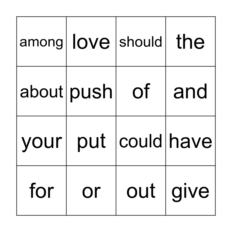 This bingo card has 19 words: could, would, should, give, have, about, out, among, love, your, put, push, of, or, for, you, the, and and as.
