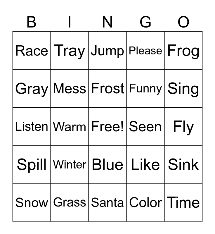 This bingo card has a free space and 25 words: Winter, Santa, Frost, Snow, Frog, Race, Gray, Tray, Seen, Blue, Funny, Listen, Like, Sink, Mess, Ask, Fly, Jump, Sing, Warm, Time, Grass, Spill, Please and Color.