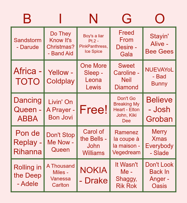This bingo card has a free space and 66 words: Mamma Mia - ABBA, Driving Home for Christmas - Chris Rea, Mistletoe - Justin Bieber, Merry Xmas Everybody - Slade, This Christmas - Donny Hathaway, Wonderful Christmastime - Paul McCartney, Do They Know It's Christmas? - Band Aid, Fairytale of New York - The Pogues, Kirsty MacColl, One More Sleep - Leona Lewis, Santa Tell Me - Ariana Grande, Carol of the Bells - John Williams, The Little Drummer Boy - Harry Simeone Chorale, Believe - Josh Groban, Stayin' Alive - Bee Gees, Bohemian Rhapsody - Queen, Africa - TOTO, Livin' On A Prayer - Bon Jovi, Sandstorm - Darude, One Dance - Drake, Wizkid, Kyla, Sweet Caroline - Neil Diamond, Don't Stop Me Now - Queen, Pon de Replay - Rihanna, Freed From Desire - Gala, Galway Girl - Ed Sheeran, Your Raise Me Up - Westlife, Milkshake - Kelis, Teenage Dirtbag - Wheatus, Closing Time - Semisonic, Don't Look Back In Anger - Oasis, Angels - Robbie Williams, Rolling in the Deep - Adele, Skyfall - Adele, Despacito - Luis Fonsi, Daddy Yankee, Bailando - Enrique Iglesias, Ramenez la coupe à la maison - Vegedream, A Thousand Miles - Vanessa Carlton, Uptown Girl - Billy Joel, Dancing Queen - ABBA, It Wasn't Me - Shaggy, Rik Rok, Temperature - Sean, Yellow - Coldplay, Viva La Vida - Coldplay, Don't Go Breaking My Heart - Elton John, Kiki Dee, BIRDS OF A FEATHER - Billie Eilish, Wannabe - Spice Girls, I Want It That Way - Backstreet Boys, NUEVAYoL - Bad Bunny, DtMF - Bad Bunny, Die With A Smile - Lady Gaga, Bruno Mars, APT. - ROSE, Bruno Mars, Espresso - Sabrina Carpenter, Not Like Us - Kendrick Lamar, Pink Pony Club - Chappell Roan, tv off(feat. lefty gunplay) - Kendrick Lamar, WHERE IS MY HUSBAND! - RAYE, Man I Need - Olivia Dean, Please Please Please - Sabrina Carpenter, Mystical Magical - Benson Boone, Boy's a liar Pt.2 - PinkPanthress, Ice Spice, NOKIA - Drake, All I Want for Christmas - Mariah Carey, Last Christmas - Wham!, Underneath the Tree - Wham!, Feliz Navidad - José Feliciano, Locked out of Heaven - Bruno Mars and I Kissed A Girl - Katy Perry.