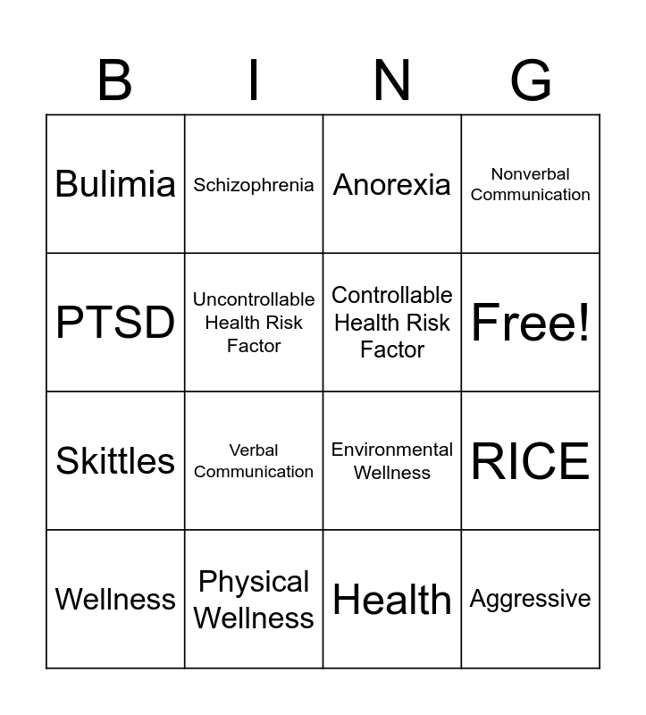 This bingo card has 17 words: Health, Wellness, Anorexia, Bulimia, Verbal Communication, Nonverbal Communication, RICE, Controllable Health Risk Factor, Free!, Uncontrollable Health Risk Factor, Physical Wellness, Environmental Wellness, PTSD, Schizophrenia, Skittles, Snickers and Aggressive.
