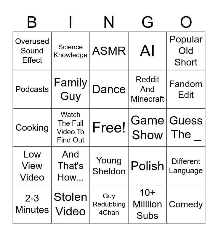 This bingo card has a free space and 24 words: And That's How..., Stolen Video, Dance, 2-3 Minutes, Popular Old Short, Overused Sound Effect, Podcasts, Science Knowledge, Game Show, Young Sheldon, Reddit And Minecraft, Cooking, Polish, Different Language, Family Guy, 10+ Milllion Subs, Guess The _, ASMR, Fandom Edit, Watch The Full Video To Find Out, Comedy, Low View Video, AI and Guy Redubbing 4Chan.