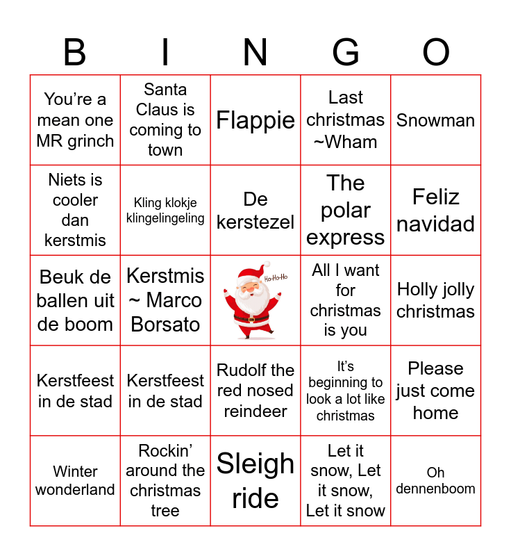 This bingo card has a free space and 24 words: Kerstfeest in de stad, Rockin’ around the christmas tree, De kerstezel, Winter wonderland, Snowman, You’re a mean one MR grinch, Niets is cooler dan kerstmis, Santa Claus is coming to town, All I want for christmas is you, Rudolf the red nosed reindeer, The polar express, Beuk de ballen uit de boom, It’s beginning to look a lot like christmas, Please just come home, Kling klokje klingelingeling, Let it snow, Let it snow, Let it snow, Holly jolly christmas, Flappie, Feliz navidad, Kerstmis ~ Marco Borsato, Oh dennenboom, Kerstfeest in de stad, Last christmas ~Wham and Sleigh ride.