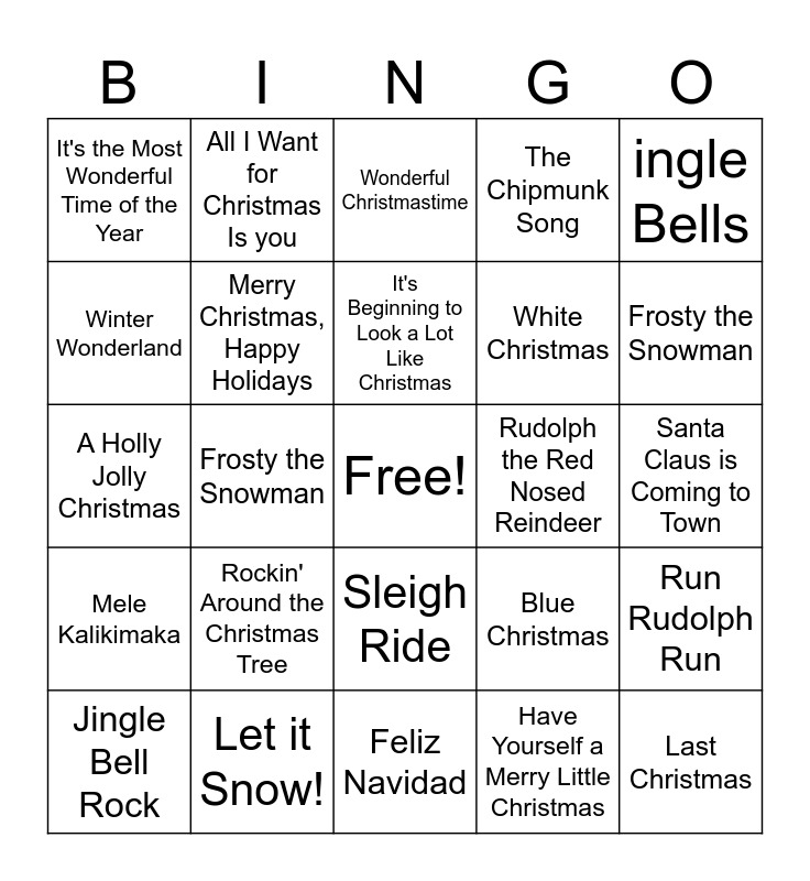 This bingo card has a free space and 24 words: Rockin' Around the Christmas Tree, Let it Snow!, It's Beginning to Look a Lot Like Christmas, Jingle Bell Rock, ingle Bells, It's the Most Wonderful Time of the Year, Winter Wonderland, All I Want for Christmas Is you, Rudolph the Red Nosed Reindeer, Sleigh Ride, White Christmas, A Holly Jolly Christmas, Blue Christmas, Run Rudolph Run, Merry Christmas, Happy Holidays, Have Yourself a Merry Little Christmas, Santa Claus is Coming to Town, Wonderful Christmastime, Frosty the Snowman, Frosty the Snowman, Last Christmas, Mele Kalikimaka, The Chipmunk Song and Feliz Navidad.