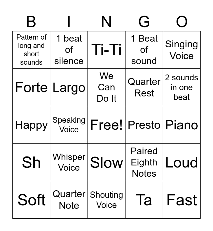 This bingo card has a free space and 24 words: Whisper Voice, Quarter Note, We Can Do It, Soft, Singing Voice, Pattern of long and short sounds, Forte, 1 beat of silence, Presto, Slow, Quarter Rest, Happy, Paired Eighth Notes, Loud, Largo, Ta, Piano, Ti-Ti, 2 sounds in one beat, Speaking Voice, Fast, Sh, 1 Beat of sound and Shouting Voice.