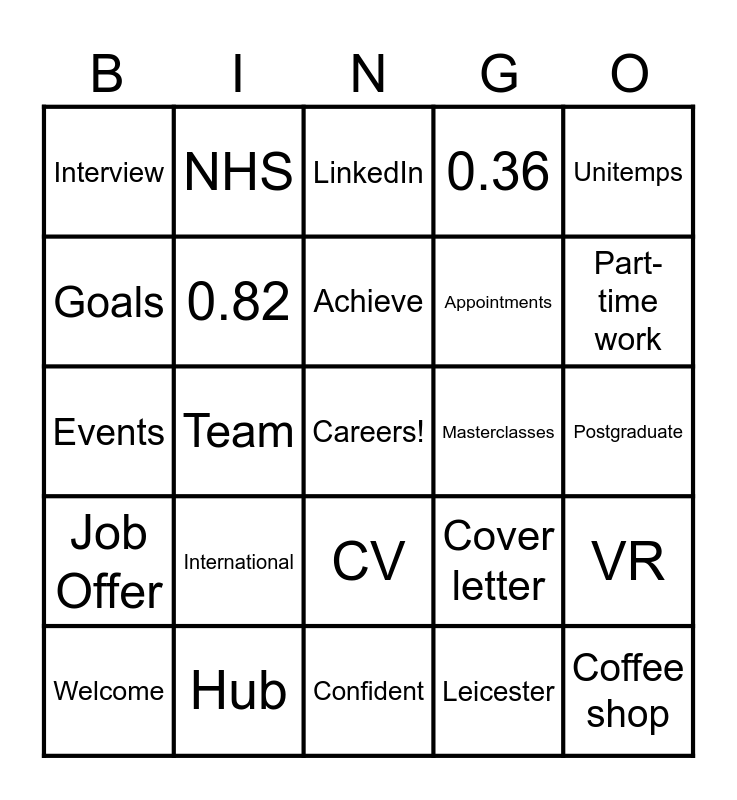 This bingo card has a free space and 34 words: Skills, Leicester, UK Career Ready, Be more, Job Offer, 0.82, Unitemps, Welcome, NHS, 55, Achieve, LinkedIn, MyGateway, Hugh Aston, Masterclasses, Part-time work, Hub, Events, International, Cover letter, CV, Be curious, Interview, Postgraduate, Confident, Coffee shop, 0.36, Future You, Appointments, Goals, Alumni, Team, VR and Emails.