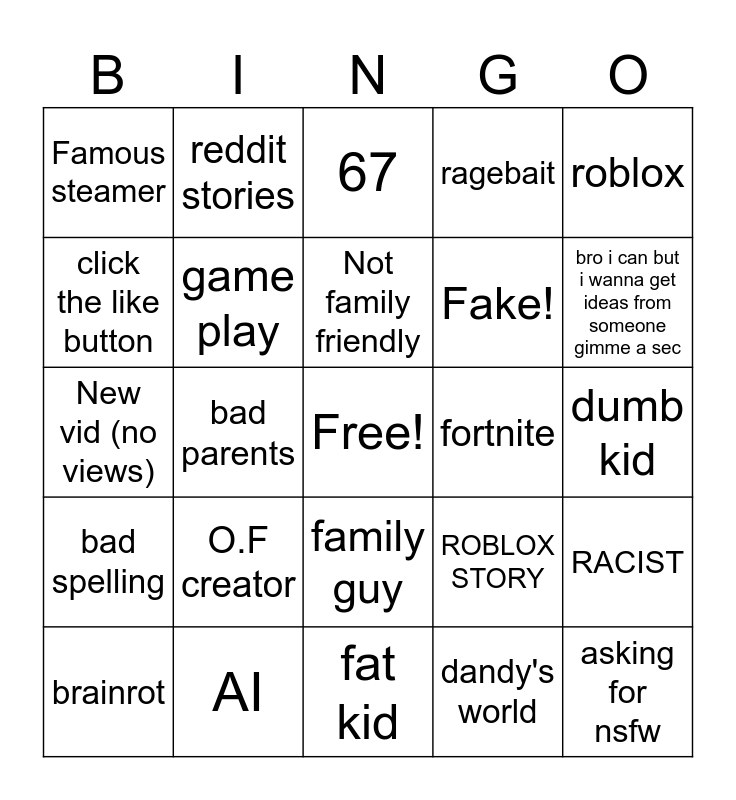 This bingo card has a free space and 24 words: O.F creator, AI, Not family friendly, brainrot, roblox, Famous steamer, click the like button, reddit stories, fortnite, family guy, Fake!, New vid (no views), ROBLOX STORY, RACIST, game play, dandy's world, dumb kid, 67, bro i can but i wanna get ideas from someone gimme a sec, bad parents, asking for nsfw, bad spelling, ragebait and fat kid.