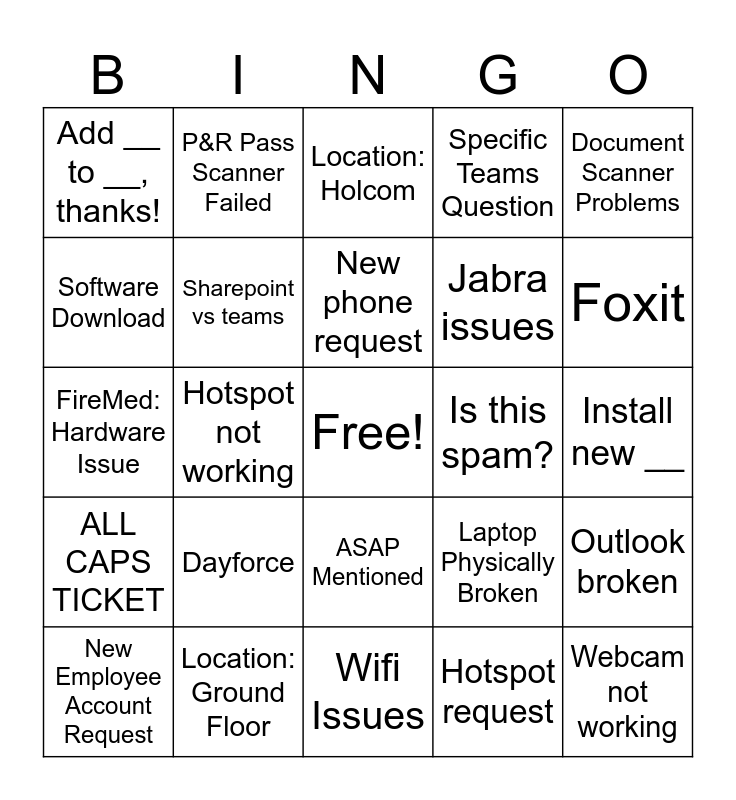 This bingo card has a free space and 52 words: Monitor Problem, Webcam not working, Password reset, Wifi Issues, Dayforce, Docking Station Failed, P&R Pass Scanner Failed, Microphone not working, Software Download, VPN Issues, Sharepoint vs teams, Teams broken, Outlook broken, Laptop Physically Broken, Phone Physically Broken, Tablet Physically Broken, New phone request, Is this spam?, Is this Phishing?, Document Scanner Problems, Hotspot not working, Hotspot request, Add __ to __, thanks!, Jabra issues, Delivery, Desk Phone Problems, 1 word ticket title, Bluebeam, Foxit, Clearly not an IT ticket, Voicemail issue, Specific Teams Question, RecTrac, Monitor Broken, Location: SPL, Location: Holcom, Location: Ground Floor, Laserfiche problem, Location: Traffic, Location: Solid Waste, Printer issues, Install new __, ALL CAPS TICKET, Termination, ASAP Mentioned, Role change, FireMed: Software issue, FireMed: Hardware Issue, Vague Ticket (Issue not in title), Word Problem, New Employee Account Request and Location: Fire (Any).