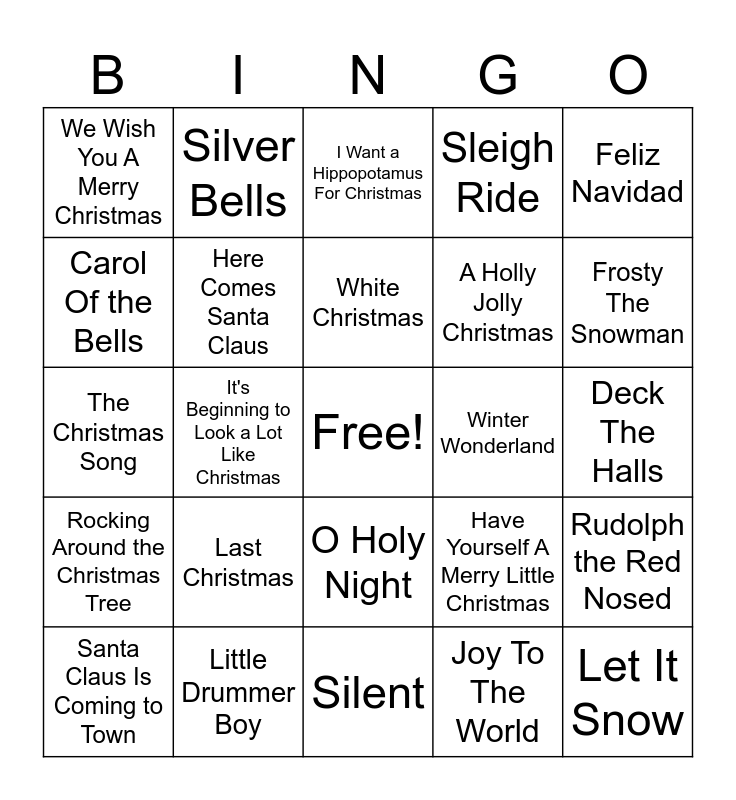 This bingo card has a free space and 28 words: Rudolph the Red Nosed, Jingle Bells, A Holly Jolly Christmas, Joy To The World, Carol Of the Bells, I Want a Hippopotamus For Christmas, Silver Bells, Rocking Around the Christmas Tree, Winter Wonderland, Santa Claus Is Coming to Town, The Christmas Song, Sleigh Ride, Little Drummer Boy, Silent, Frosty The Snowman, All I Want for Christmas Is You, Last Christmas, Here Comes Santa Claus, White Christmas, O Holy Night, We Wish You A Merry Christmas, Santa Baby, Let It Snow, It's Beginning to Look a Lot Like Christmas, Deck The Halls, Have Yourself A Merry Little Christmas, Feliz Navidad and Jingle Bell Rock.