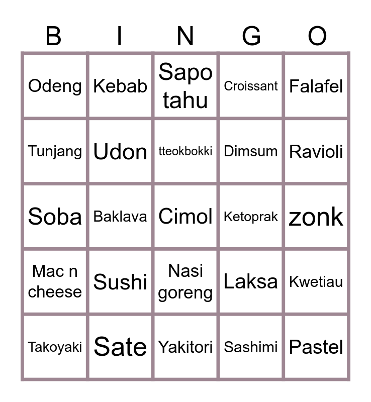 This bingo card has 69 words: hfhf, zonk, Risotto, Bakpau, Sate, Kimchi, Croissant, Gudeg, Falafel, Apple pie, Kwetiau, Bolognese, Odeng, Sapo tahu, Tiramisu, Baklava, Nasi goreng, Dimsum, Rujak, Mac n cheese, Ketoprak, Laksa, Ravioli, Pempek, Bebek peking, Carbonara, Urab, Zuppa zoup, Sashimi, Rendang, Kebab, Hummus, Jasuke, Capcay, Fried chicken, Pisang ijo, Lumpia, Okonomiyaki, Tunjang, Pastel, Sushi, Cimol, Gado-gado, Hainan, Ramen, Takoyaki, Lotek, Seblak, Bakso, Udon, tteokbokki, Lasagna, Biryani, Yakitori, Tongseng, Makaroni, Tomyum, Bibimbap, Sambal setan, Soba, Kebuli, Cilok, Corndog, Hotdog, Fuyunghai, Kimbap, Lapis legit, Roti maryam and Jjajangmyeon.