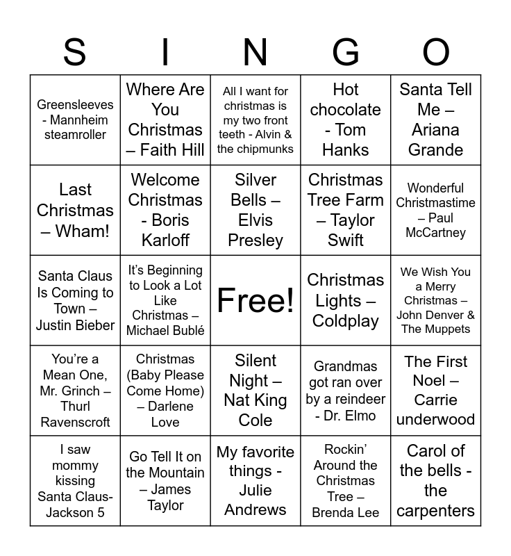 This bingo card has a free space and 87 words: White Christmas – Bing Crosby, Jingle Bells – Frank Sinatra, Silent Night – Nat King Cole, O Holy Night – Celine Dion, The Christmas Song – Neil diamond, Joy to the World – Mormon Tabernacle Choir, Away in a Manger – Anne Murray, O Come All Ye Faithful – Mariah Carey, Hark! The Herald Angels Sing – Amy Grant, Deck the Halls – Mickey and his friends, God Rest Ye Merry, Gentlemen – barenaked ladies, It Came Upon a Midnight Clear – Josh Groban, The First Noel – Carrie underwood, We Wish You a Merry Christmas – John Denver & The Muppets, Little Drummer Boy – Bing Crosby & David Bowie, Silver Bells – Elvis Presley, Rudolph the Red-Nosed Reindeer – Gene Autry, Frosty the Snowman – Jimmy Durante, Have Yourself a Merry Little Christmas – Sabrina carpenter, I’ll Be Home for Christmas – rascal flats, Winter Wonderland – eurythmics, Let It Snow! Let It Snow! Let It Snow! – Glee cast, Santa Claus Is Coming to Town – Justin Bieber, Sleigh Ride – The Ronettes, Rockin’ Around the Christmas Tree – Brenda Lee, Blue Christmas – Elvis Presley, Feliz Navidad – José Feliciano, Do You Hear What I Hear? – Idina Menzel, Carol of the Bells – Pentatonix, O Come, O Come Emmanuel – Enya, Go Tell It on the Mountain – James Taylor, What Child Is This? – Andrea Bocelli, Angels We Have Heard on High – Josh Groban, Christmas (Baby Please Come Home) – Darlene Love, Last Christmas – Wham!, All I Want for Christmas Is You – Mariah Carey, Wonderful Christmastime – Paul McCartney, Happy Xmas (War Is Over) – John Lennon & Yoko Ono, Merry Christmas Darling – The Carpenters, It’s Beginning to Look a Lot Like Christmas – Michael Bublé, This Christmas – Donny Hathaway, The Most Wonderful Time of the Year – Andy Williams, Underneath the Tree – Kelly Clarkson, Christmas Lights – Coldplay, Mistletoe – Justin Bieber, Santa Tell Me – Ariana Grande, Believe – Josh Groban, Where Are You Christmas – Faith Hill, My Grown-Up Christmas List – Amy Grant, Christmas Time Is Here – Vince Guaraldi Trio, Linus and Lucy – Vince Guaraldi Trio, A Holly Jolly Christmas – Burl Ives, You’re a Mean One, Mr. Grinch – Thurl Ravenscroft, Baby, It’s Cold Outside – Glee cast, Christmas Eve / Sarajevo 12/24 – Trans-Siberian Orchestra, Do They Know It’s Christmas? – Band Aid, Christmas Tree Farm – Taylor Swift, Candy Cane Lane – Sia, Mary, Did You Know? – Donny Osmond, Hot chocolate - Tom Hanks, Welcome Christmas - Boris Karloff, We need a little Christmas - glee cast, The twelve days of Christmas - straight no chaser, The chipmunk song - Alvin & the chipmunks, The polar express - tom hanks, River - Sarah Mclachlan, I wonder when he comes again - the Osmonds, I saw mommy kissing Santa Claus- Jackson 5, Carol of the bells - the carpenters, Christmas waltz - the carpenters, FaLaLa - Justin Bieber, I want a hippopotamus for Christmas - Gayla Peevey, All I want for christmas is my two front teeth - Alvin & the chipmunks, Grandmas got ran over by a reindeer - Dr. Elmo, Don’t be a jerk, it’s Christmas - sponge bob, Hot cup of cocoa - the von trapp children, Jingle bell rock - Bobby helms, My favorite things - Julie Andrews, O Christmas tree - Glee cast, The Chanukah song - Adam Sandler, Dance of the sugarplum fairy, Do you want to build a snowman - frozen, Little Saint Nick - The Beach Boys, You make it feel like Christmas - gwen Stefani, Mele kalikimaka - jimmy buffett, Greensleeves - Mannheim steamroller and Please come home for Christmas - eagles.
