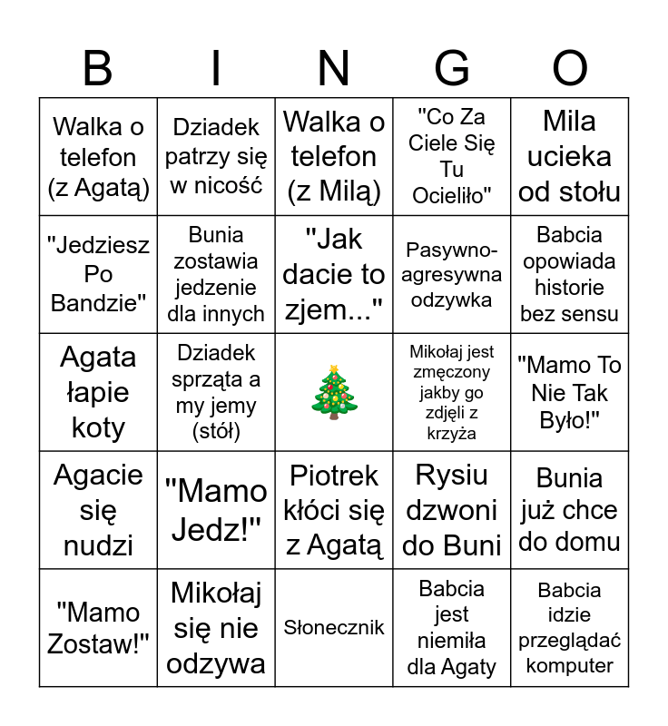 This bingo card has a free space and 29 words: ''Mamo Zostaw!'', ''Mamo Nie Dawaj Im'', Dziadek sprząta a my jemy (stół), Dziadek sprząta a my jemy (Odkurza), Walka o telefon (z Agatą), Walka o telefon (z Milą), Bunia zostawia jedzenie dla innych, ''Mamo Jedz!'', Mikołaj jest zmęczony jakby go zdjęli z krzyża, Mikołaj się nie odzywa, ''Mamo To Nie Tak Było!'', Babcia idzie przeglądać komputer, Słonecznik, Babcia jest niemiła dla Agaty, Babcia opowiada historie bez sensu, ''Chodź Ci Coś Dam'', Piotrek kłóci się z Agatą, Agacie się nudzi, Mila ucieka od stołu, Agata łapie koty, Rysiu dzwoni do Buni, ''Zjedz jeszcze coś'', Pasywno-agresywna odzywka, ''Jedziesz Po Bandzie'', ''Co Za Ciele Się Tu Ocieliło'', Dziadek patrzy się w nicość, Bunia już chce do domu, ''Jak dacie to zjem...'' and ''Tobie Już Starczy!''.