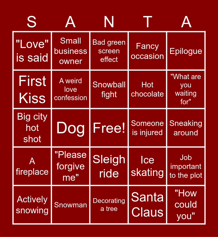 This bingo card has a free space and 49 words: Scene in a kitchen, "How could you", A "Scrooge", Decorating a tree, "Please forgive me", X-Mas music/Carolers, Small business owner, Come to Jesus, First Kiss, A kid, A weird love confession, Fancy occasion, Job important to the plot, Ice skating, A clumsy moment, Sledding, Snowball fight, Someone is injured, candy cane, Epilogue, Dog, Santa Claus, "Love" is said, Hot chocolate, An extra does something weird, "What are you waiting for", Actively snowing, Horseback riding, Sleigh ride, A fireplace, They get engaged, Montage, Bad/awkward transition, Public domain/AI Christmas song, Snowman, Flannel, A piece of jewelry featured, Crystal clear FaceTime, Sneaking around, Love triangle, Secret identity, Someone is or is related to Santa, Makeover, Small town, Big city hot shot, Bad green screen effect, Airport scene, A gift is given and Gingerbread house building.
