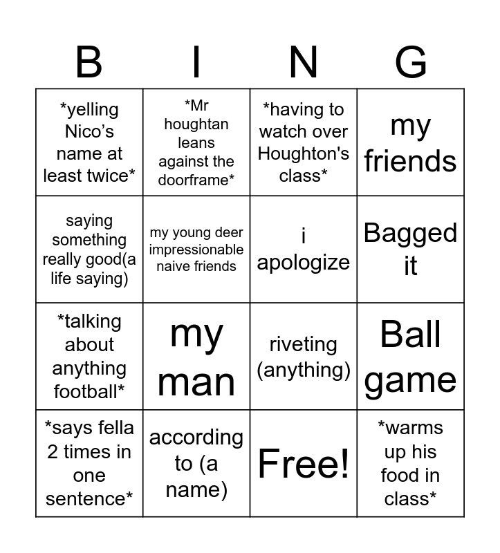 This bingo card has 17 words: Free!, *says fella 2 times in one sentence*, *having to watch over Houghton's class*, *yelling Nico’s name at least twice*, my man, my friends, Ball game, i apologize, Bagged it, my young deer impressionable naive friends, according to (a name), riveting (anything), saying something really good(a life saying), *Mr houghtan leans against the doorframe*, *talking about anything football*, Yes sirrr and *warms up his food in class*.