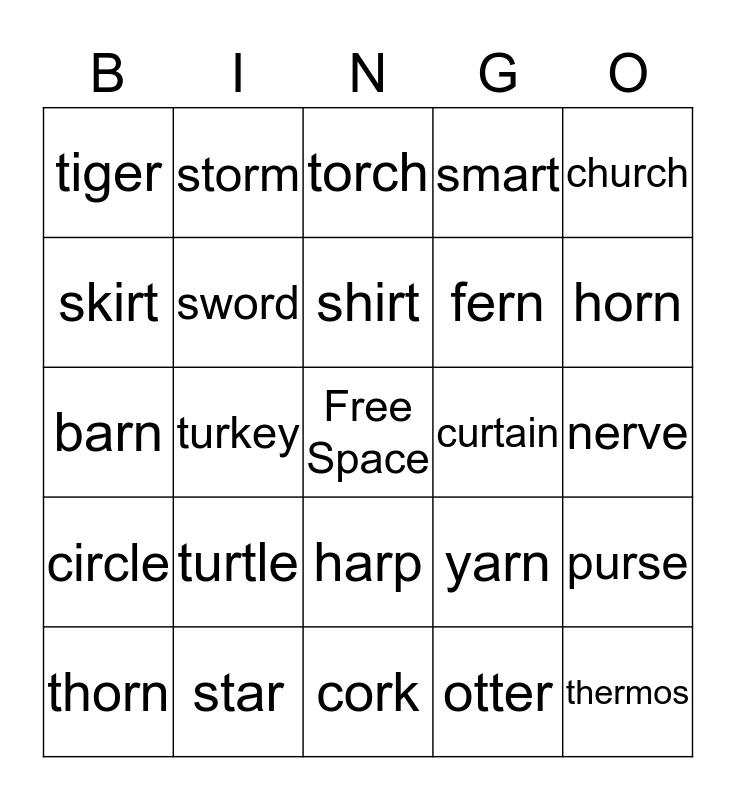 This bingo card has a free space and 24 words: turtle, star, shirt, thorn, church, tiger, skirt, storm, curtain, harp, fern, barn, yarn, purse, sword, otter, nerve, torch, horn, turkey, thermos, circle, smart and cork.
