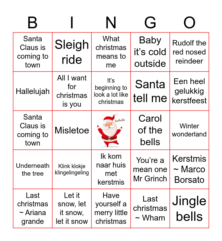 This bingo card has a free space and 24 words: Klink klokje klingelingeling, Let it snow, let it snow, let it snow, It’s beginning to look a lot like christmas, Last christmas ~ Ariana grande, Rudolf the red nosed reindeer, Santa Claus is coming to town, Hallelujah, Sleigh ride, Carol of the bells, Ik kom naar huis met kerstmis, Santa tell me, Santa Claus is coming to town, You’re a mean one Mr Grinch, Kerstmis ~ Marco Borsato, All I want for christmas is you, Last christmas ~ Wham, Winter wonderland, What christmas means to me, Een heel gelukkig kerstfeest, Misletoe, Jingle bells, Underneath the tree, Baby it’s cold outside and Have yourself a merry little christmas.
