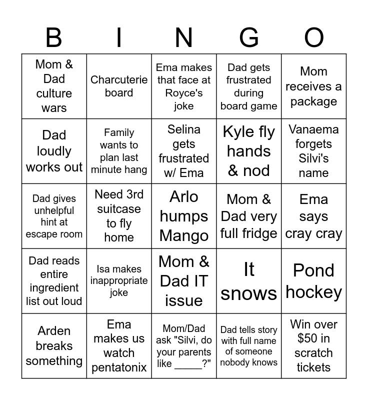 This bingo card has a free space and 24 words: Isa makes inappropriate joke, Ema makes us watch pentatonix, Selina gets frustrated w/ Ema, Arden breaks something, Mom receives a package, Mom & Dad culture wars, Dad loudly works out, Charcuterie board, Mom & Dad very full fridge, Mom & Dad IT issue, Kyle fly hands & nod, Dad gives unhelpful hint at escape room, It snows, Pond hockey, Family wants to plan last minute hang, Dad tells story with full name of someone nobody knows, Ema says cray cray, Ema makes that face at Royce's joke, Vanaema forgets Silvi's name, Need 3rd suitcase to fly home, Win over $50 in scratch tickets, Dad reads entire ingredient list out loud, Dad gets frustrated during board game and Mom/Dad ask "Silvi, do your parents like _____?".