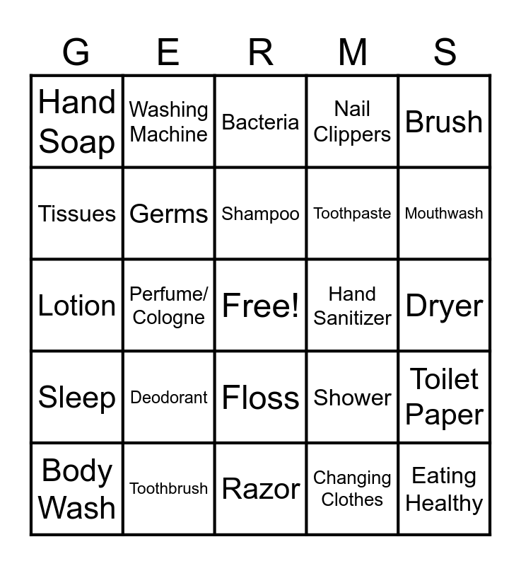 This bingo card has a free space and 24 words: Deodorant, Toothbrush, Shampoo, Body Wash, Brush, Hand Soap, Tissues, Washing Machine, Hand Sanitizer, Floss, Toothpaste, Lotion, Shower, Toilet Paper, Germs, Changing Clothes, Dryer, Bacteria, Mouthwash, Perfume/ Cologne, Eating Healthy, Sleep, Nail Clippers and Razor.