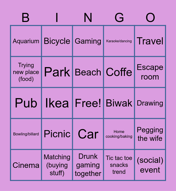 This bingo card has a free space and 24 words: Picnic, Matching (buying stuff), Beach, Cinema, Travel, Aquarium, Trying new place (food), Bicycle, Biwak, Car, Coffe, Pub, Home cooking/baking, Pegging the wife, Park, Tic tac toe snacks trend, Drawing, Gaming, Escape room, Ikea, (social) event, Bowling/billard, Karaoke/dancing and Drunk gaming together.