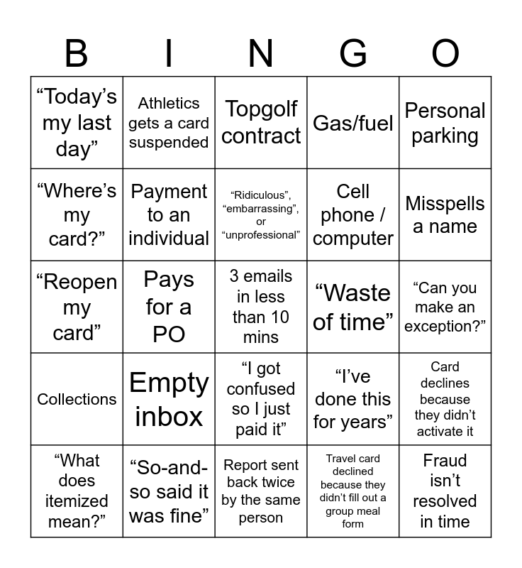 This bingo card has a free space and 48 words: The Boy Who Cried Fraud, Fraud isn’t resolved in time, “Does the bank have more info?”, Report sent back twice by the same person, Empty inbox, Complains to Matt about T&L policy, Athletics gets a card suspended, Complaint is in all caps / bold / underlined, “Where’s my card?”, Cc’s 4+ people, Payment to an individual, Gas/fuel, Card declines because they didn’t activate it, “I’ve done this for years”, Report > 2 weeks late, 2 consecutive late reports, “Ridiculous”, “embarrassing”, or “unprofessional”, “Waste of time”, “It’s not my fault”, Personal parking, Pays for a PO, Travel card declined because they didn’t fill out a group meal form, “Today’s my last day”, Cell phone / computer, 5+ travel expenses on one report, Misspells a name, “What does itemized mean?”, “I thought I submitted the report”, “I got confused so I just paid it”, Collections, Gift card to employee, “Remove these points”, “Transfer the points to me”, Missing 3+ receipts on one report, “So-and-so said it was fine”, “Unknown charge” in business purpose field, “Sorry, I’m new”, “Can you make an exception?”, Complains about Contract policy, “I can’t submit the report, I’m missing a receipt”, Have to cc 2+ people to get a response, New cardholder gets points on their first report, Topgolf contract, “I don’t understand the problem”, “Reopen my card”, Cardholder gives a Wolverine Sighting, “Sorry, I was out of office” and “That’s not fair”.