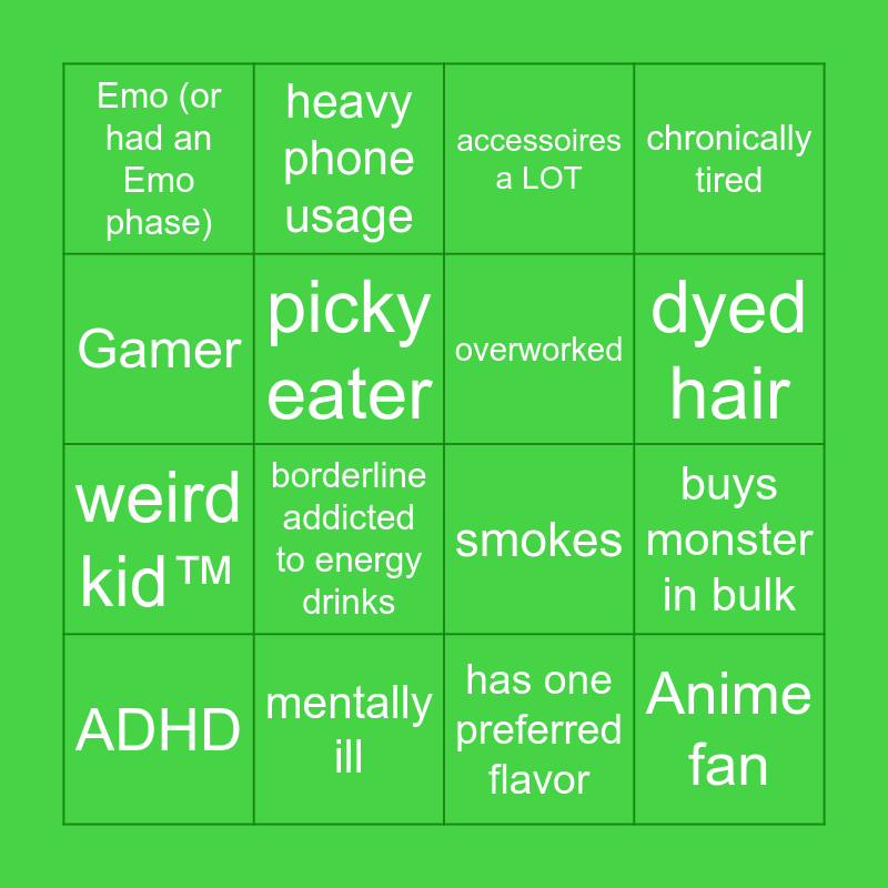 This bingo card has 16 words: mentally ill, buys monster in bulk, accessoires a LOT, Emo (or had an Emo phase), weird kid™, heavy phone usage, smokes, has one preferred flavor, Gamer, picky eater, ADHD, chronically tired, borderline addicted to energy drinks, dyed hair, overworked and Anime fan.