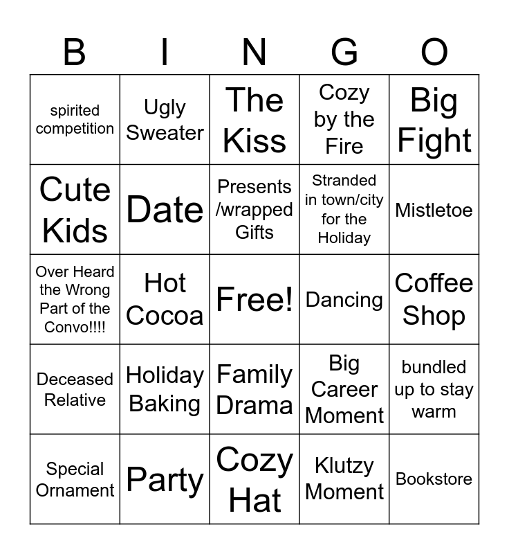 This bingo card has a free space and 30 words: Party, Decorate Tree, Hot Cocoa, Snowing, spirited competition, The Kiss, Date, Family Drama, Dancing, Cozy Hat, Coffee Shop, Bookstore, Klutzy Moment, someone wears plaid, Mistletoe, Santa, Big Career Moment, Deceased Relative, Holiday Baking, Big Fight, Over Heard the Wrong Part of the Convo!!!!, Christmas Spirit, Ugly Sweater, Stranded in town/city for the Holiday, Cute Kids, Cozy by the Fire, bundled up to stay warm, Special Ornament, Presents /wrapped Gifts and Cute animals.