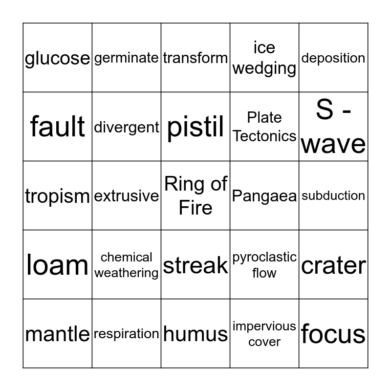 This bingo card has a free space and 24 words: chemical weathering, respiration, pistil, mantle, deposition, glucose, fault, germinate, Pangaea, streak, Plate Tectonics, tropism, pyroclastic flow, crater, divergent, impervious cover, subduction, transform, S - wave, extrusive, focus, loam, ice wedging and humus.