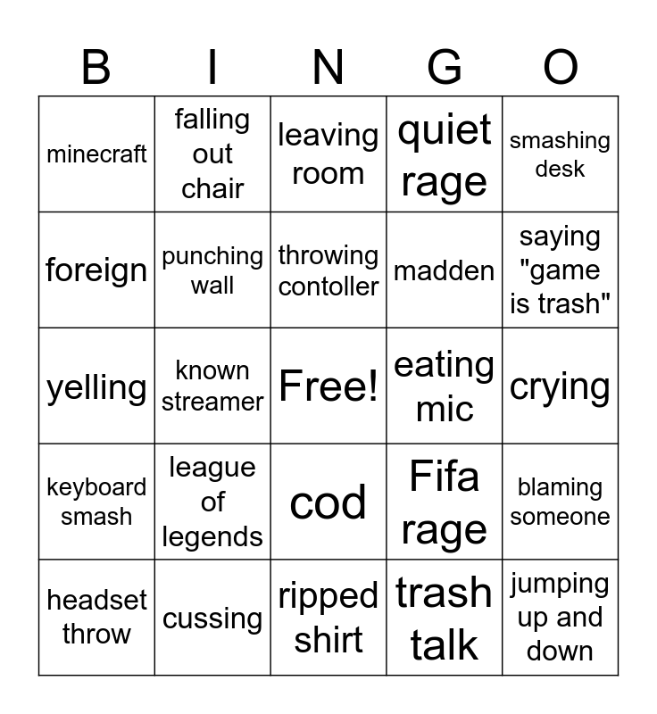 This bingo card has a free space and 24 words: league of legends, cussing, throwing contoller, headset throw, smashing desk, minecraft, foreign, falling out chair, eating mic, cod, madden, yelling, Fifa rage, blaming someone, punching wall, trash talk, crying, leaving room, saying "game is trash", known streamer, jumping up and down, keyboard smash, quiet rage and ripped shirt.