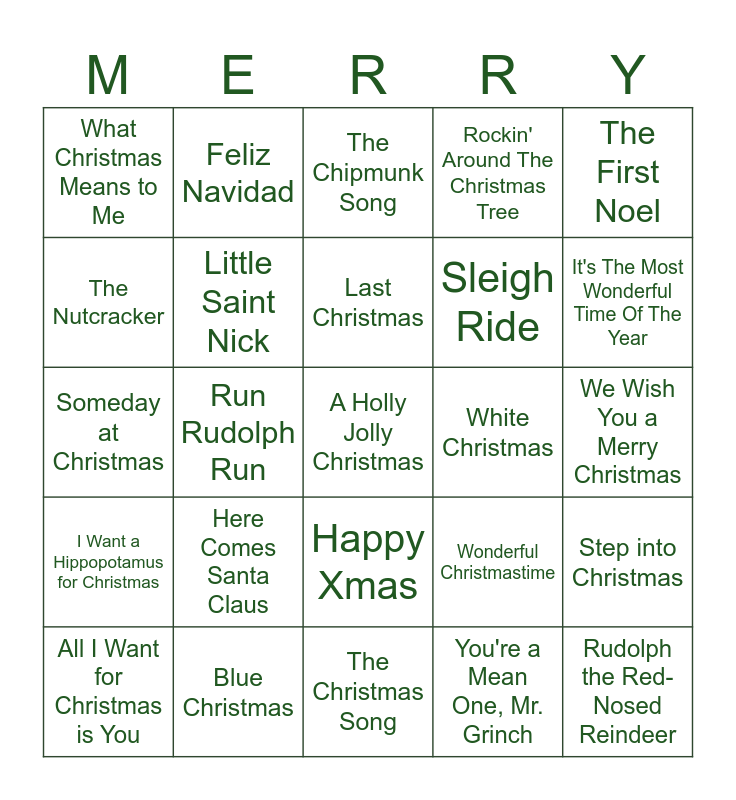 This bingo card has a free space and 29 words: All I Want for Christmas is You, Frosty the Snowman, Run Rudolph Run, Grandma Got Run Over by a Reindeer, What Christmas Means to Me, The Chipmunk Song, Little Saint Nick, Here Comes Santa Claus, White Christmas, Blue Christmas, We Wish You a Merry Christmas, Rudolph the Red-Nosed Reindeer, The Christmas Song, You're a Mean One, Mr. Grinch, It's The Most Wonderful Time Of The Year, Let it Snow, Happy Xmas, I Want a Hippopotamus for Christmas, The First Noel, Someday at Christmas, Wonderful Christmastime, Winter Wonderland, Sleigh Ride, The Nutcracker, Rockin' Around The Christmas Tree, Feliz Navidad, Step into Christmas, Last Christmas and Jingle Bell Rock.