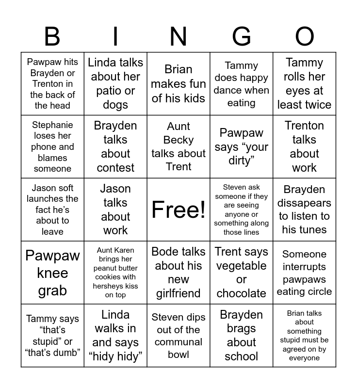 This bingo card has a free space and 24 words: Aunt Karen brings her peanut butter cookies with hersheys kiss on top, Linda walks in and says “hidy hidy”, Aunt Becky talks about Trent, Tammy says “that’s stupid” or “that’s dumb”, Tammy rolls her eyes at least twice, Pawpaw hits Brayden or Trenton in the back of the head, Stephanie loses her phone and blames someone, Linda talks about her patio or dogs, Steven ask someone if they are seeing anyone or something along those lines, Bode talks about his new girlfriend, Pawpaw says “your dirty”, Jason soft launches the fact he’s about to leave, Trent says vegetable or chocolate, Someone interrupts pawpaws eating circle, Brayden talks about contest, Brayden brags about school, Brayden dissapears to listen to his tunes, Brian makes fun of his kids, Trenton talks about work, Jason talks about work, Brian talks about something stupid must be agreed on by everyone, Pawpaw knee grab, Tammy does happy dance when eating and Steven dips out of the communal bowl.