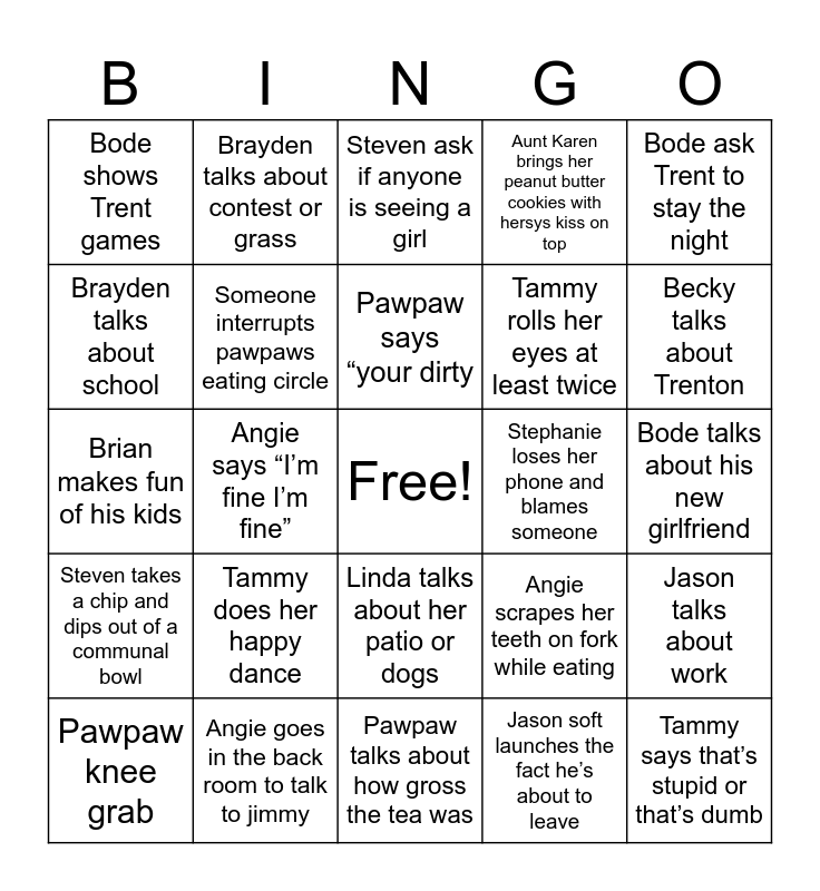 This bingo card has a free space and 24 words: Tammy does her happy dance, Angie goes in the back room to talk to jimmy, Pawpaw says “your dirty, Pawpaw knee grab, Bode ask Trent to stay the night, Bode shows Trent games, Brayden talks about school, Brayden talks about contest or grass, Stephanie loses her phone and blames someone, Linda talks about her patio or dogs, Tammy rolls her eyes at least twice, Brian makes fun of his kids, Angie scrapes her teeth on fork while eating, Jason talks about work, Someone interrupts pawpaws eating circle, Jason soft launches the fact he’s about to leave, Bode talks about his new girlfriend, Steven ask if anyone is seeing a girl, Becky talks about Trenton, Angie says “I’m fine I’m fine”, Tammy says that’s stupid or that’s dumb, Steven takes a chip and dips out of a communal bowl, Aunt Karen brings her peanut butter cookies with hersys kiss on top and Pawpaw talks about how gross the tea was.