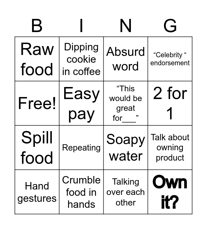 This bingo card has 16 words: Crumble food in hands, Talk about owning product, Absurd word, Raw food, Spill food, Dipping cookie in coffee, Soapy water, Talking over each other, Free!, Easy pay, Hand gestures, “Celebrity “ endorsement, Repeating, 2 for 1, “This would be great for___” and Own it?.
