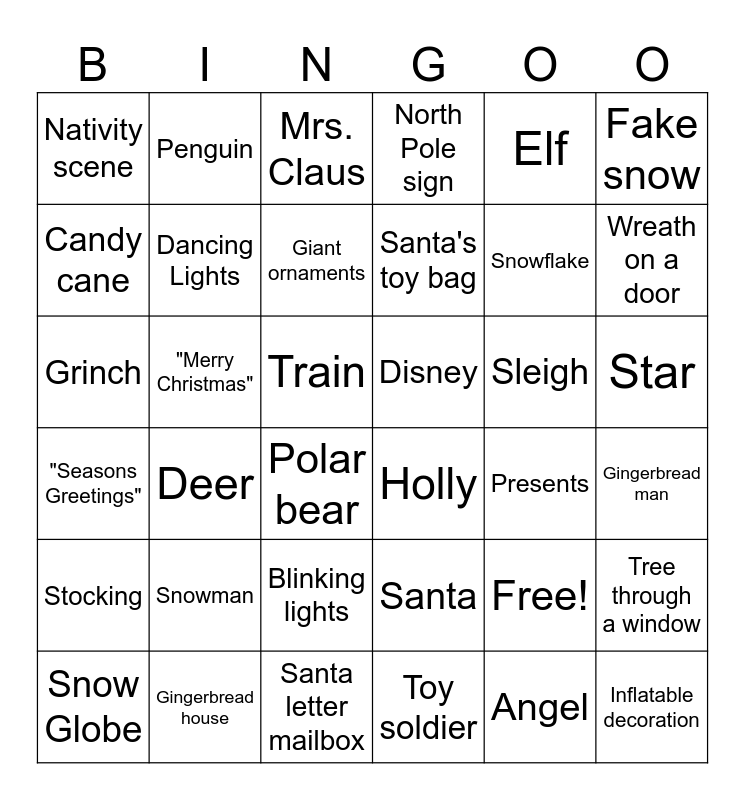 This bingo card has 37 words: Free!, Santa, Angel, Candy cane, Deer, Sleigh, Dancing Lights, Toy soldier, Elf, Snow Globe, Wreath on a door, North Pole sign, Grinch, Train, Fake snow, Disney, Snowman, Mrs. Claus, Star, "Merry Christmas", Nativity scene, Santa's toy bag, Polar bear, Presents, Gingerbread house, Gingerbread man, Penguin, Santa letter mailbox, Tree through a window, Blinking lights, "Joy", Holly, Snowflake, Stocking, "Seasons Greetings", Giant ornaments and Inflatable decoration.