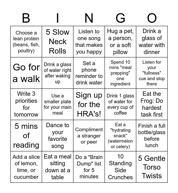 This bingo card has a free space and 53 words: 20 Arm Circles (forward/back), 5 Gentle Torso Twists, 15 Shoulder Shrugs, 10 Standing Side Crunches, Dance to your favorite song, 10 Seated Bicep Curls (no weights needed), 5 Slow Neck Rolls, 10 Seated Leg Extensions, Go for a walk, 20 Seconds Wrist & Ankle Circles, Drink a glass of water right after waking up, Bring a water bottle on a walk or errand, Finish a full bottle/glass before lunch, Eat a "hydrating snack" (watermelon or celery), Drink water out of your favorite "fancy" glass, Add a slice of lemon, lime, or cucumber, Set a phone reminder to drink water, Drink 1 glass of water for every cup of coffee, Swap a sugary soda for sparkling water, Drink a glass of water with dinner, Use a smaller plate for your main meal, Try a new recipe you've never made before, Spend 10 mins "meal prepping" one ingredient, Choose a lean protein (beans, fish, poultry), Prepare a healthy lunch for tomorrow, Eat a meal sitting down at a table, Eat a meal without looking at a screen, Avoid added sugar for one whole afternoon, Read the nutrition label on a favorite snack, Listen for your "fullness" cue and stop there, Do 1 minute of Box Breathing, Put your phone in another room for 20 mins, Organize one small space (like a drawer), Write down 3 things you are grateful for, Name 5 things you can see right now (5-4-3-2-1 Exercise), Doodle or color for 5 minutes, Hug a pet, a person, or a soft pillow, Do a "Brain Dump" list for 5 minutes, Listen to one song that makes you happy, Say "No" to an unnecessary task, Use positive self-talk/affirmations (e.g., "I can handle this"), Write a kind text/note to a friend, Eat the Frog: Do hardest task first, Leave a positive sticky note, Say "Thank You" instead of "Sorry", Compliment a stranger or peer, Reflect on one "win" from yesterday, Tidy workspace for 3 mins, Write 3 priorities for tomorrow, 5 mins of reading, Reframe a mistake as a lesson, 1 hour "No Notification" block and Practice Active Listening.
