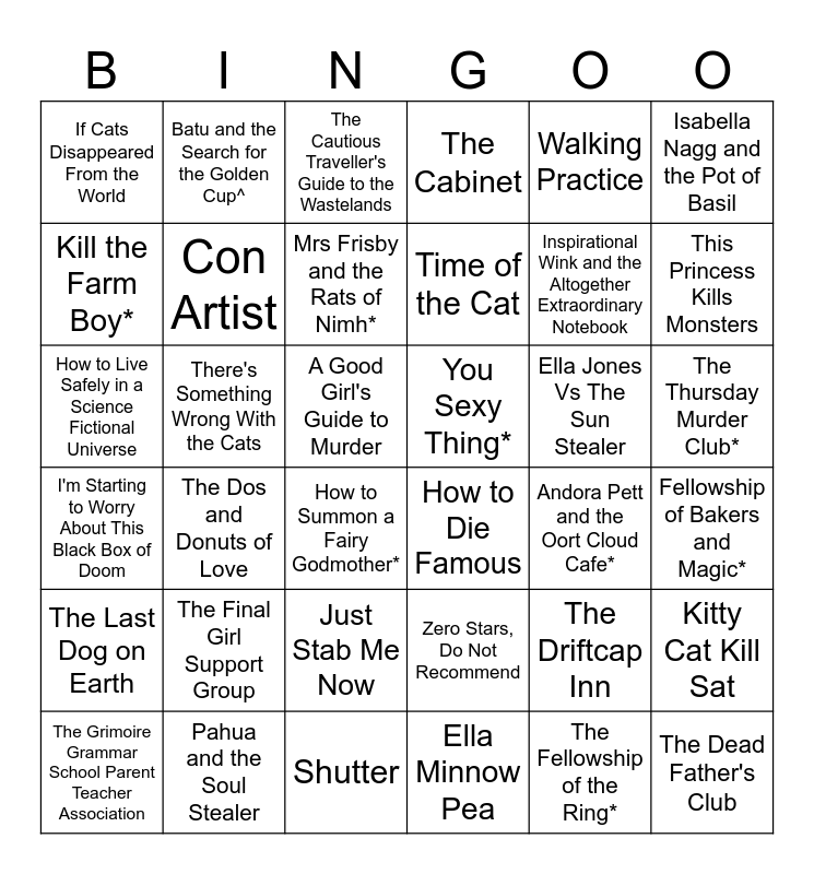 This bingo card has 36 words: Zero Stars, Do Not Recommend, Just Stab Me Now, Ella Minnow Pea, Kill the Farm Boy*, I'm Starting to Worry About This Black Box of Doom, You Sexy Thing*, Con Artist, Shutter, Walking Practice, The Driftcap Inn, This Princess Kills Monsters, The Cabinet, Kitty Cat Kill Sat, There's Something Wrong With the Cats, Time of the Cat, If Cats Disappeared From the World, The Last Dog on Earth, Ella Jones Vs The Sun Stealer, How to Live Safely in a Science Fictional Universe, The Cautious Traveller's Guide to the Wastelands, A Good Girl's Guide to Murder, The Dos and Donuts of Love, How to Die Famous, How to Summon a Fairy Godmother*, Andora Pett and the Oort Cloud Cafe*, Batu and the Search for the Golden Cup^, Inspirational Wink and the Altogether Extraordinary Notebook, Pahua and the Soul Stealer, Mrs Frisby and the Rats of Nimh*, Isabella Nagg and the Pot of Basil, The Dead Father's Club, The Grimoire Grammar School Parent Teacher Association, Fellowship of Bakers and Magic*, The Thursday Murder Club*, The Final Girl Support Group and The Fellowship of the Ring*.