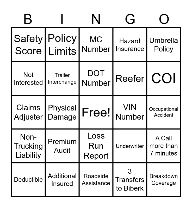 This bingo card has a free space and 33 words: Liability Insurance, Motor Truck Cargo, Physical Damage, Bobtail Insurance, Non-Trucking Liability, Trailer Interchange, Umbrella Policy, Deductible, Policy Limits, FMCSA, DOT Number, MC Number, ELD Requirements, ICC Filing, VIN Number, COI, Additional Insured, Claims Adjuster, Premium Audit, Underwriter, Loss Run Report, Driver History, Safety Score, Occupational Accident, Roadside Assistance, Breakdown Coverage, Hazard Insurance, Reefer, Not Interested, A Call more than 7 minutes, 3 Transfers to Progressive, 3 Transfers to Biberk and T2 Wade.